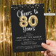 Celebrate an 80th birthday with these elegant and festive party invitations featuring the title CHEERS TO 80 YEARS with faux metallic gold balloon numbers and modern script typography and confetti in your choice of background colour (shown in black). ASSISTANCE: For help with design modification or personalisation, transferring the design to another product or if you would like coordinating items, contact the designer BEFORE ordering via Zazzle Chat or email makeitaboutyoustore@gmail.com.