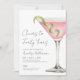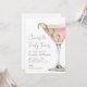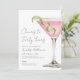 On the right, a watercolor pink cosmopolitan martini with a green lime twist adds a playful, grown-up touch. The vertical layout keeps things simple and tidy, with the party details set in a clean mix of serif and script fonts.