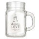Toast to the start of your happily ever after with these wedding favour mason jars featuring "cheers to love" in black calligraphy script and vintage block typography, topped with two champagne flute illustrations joined by an effervescent heart. Personalise with your names and wedding date beneath for a unique and contemporary wedding favour!