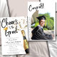 Cheers to the Grad Champagne Toast Graduation Party Announcement - A modern and unique personalised graduation party invite announcement. Featuring a festive champagne bottle with confetti. The phrase "Cheers to the Grad" is written in brush script typography. Edit this college or university graduation invitation template with your own event details. On the back, add your graduate's picture to the arch frame. Also available as an instant digital download, perfect for sending via text, email or social media.