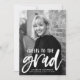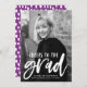 Stylish, modern graduation announcements featuring the graduate's vertical photo with "Cheers to the grad" in a white, hand-lettered brush script. Personalise the front of the announcement by adding the graduate's name, school name, and graduation year. The photo graduation announcement reverses to display a purple and white abstract dot pattern.