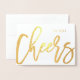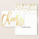 This elegant, modern happy new year card says "cheers" in gold trendy script typography on the front, with a spot to add the year. The inside features a burst of a confetti design, along with your personal message. Please note that only the front of the card is metallic gold; the inside confetti is just a faux printed effect.