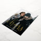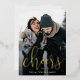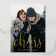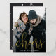 Bold and elegant New Year photo cards feature a vertical or portrait orientated photo with "cheers to [year]" overlaid in gold foil calligraphy script lettering. Personalise with a message or family signature along the bottom.