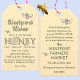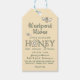 A sweet pale yellow FDA-compliant honey product tag with a few cheery bees and a stylised flower that replaces the "O" in the word honey.