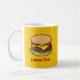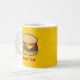 Cheeseburger cartoon illustration. Junk food outline icons yellow pattern background. Custom text on both sides.