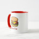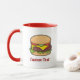 Cheeseburger cartoon illustration. Junk food outline icons yellow pattern background. Custom text on both sides.