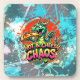 A playful dragon with horns eagerly devours a cheesy pizza slice, embodying the chaos of a fun and delicious pizza party.