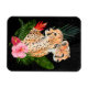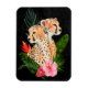Cheetah Bouquet II by Annie Warren. Two cheetahs are framed by tropical leaves and greenery against a black background. | 164453Z