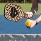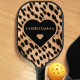 Cute tan brown and black cheetah print pickleball paddle with heart shape for women and girls. Customise the name for a personalised gift.