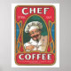 An art nouveau coffee advertisement featuring a smiling chef. An elegant, decorative, colorful illustration for a vintage kitchen.