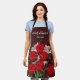 Personalised rose printed apron. Red roses with pink flowers and green stems and leaves. Maroon background, Chef ----- Love you.