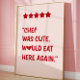 Add humor and personality to your space with this playful “Chef Was Cute, Would Eat Here Again” poster—a fun twist on the classic five-star restaurant review. Featuring bold red typography, a soft pink background, and star-rating accents, this design instantly feels modern, trendy, and made for food lovers with a sense of humor.