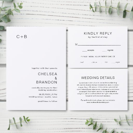 Modern All In One Wedding Invitation featuring a simple and minimalist layout with your wedding details in right alignment along with your favourite photo at the top. All design elements are in black and white and may be changed in the design editing tool. This chic "seal and send" all in one wedding invitation with a minimal yet elegant design goes well with any style of contemporary wedding.