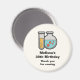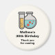 Birthday thank you magnet with a cute illustration of a test tube holding yellow liquid and a rounded flask/beaker holding green liquid with red bubbles.