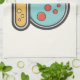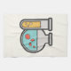 A kitchen towel with a cute illustration of a test tube holding yellow liquid and a rounded flask/beaker holding green liquid with red bubbles.