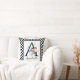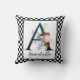 Lovely throw pillow features beautiful fancy florals include gold leaves, purple rose and blue wildflowers embellishments on large letter / initial A with a black and white chequerboard border. Personalise with first or last name