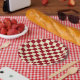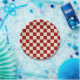 Abstract digital art of burgundy red and cream coloured squares in a chequered formation.