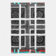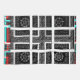 Chequered Pattern: The alternating red and cyan lines in the border, combined with the black and white squares in the centre, create a visually engaging chequered motif. The repetition and layering add to the complexity.