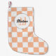 Chequered peach white geometric retro Monogram Christmas Stocking. Chequered squares geometric retro pattern Holiday gift. Cool retro chequered geometric square pattern. Vintage tile peach white modern chequered. Personalise with your custom initial and name.