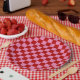 Abstract digital art of red and hot pink squares in a chequered formation. With the ability to change the pink squares by changing the background colour to match the red squares.