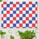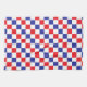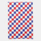 Abstract digital art of red and blue colour squares in a chequered formation with white in the alternating squares.