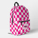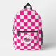Chequered squares hot pink white geometry Monogram Printed Backpack. Cool fashion accessory bag for her. Cool retro chequered geometric square pattern. Vintage tile white and hot pink modern chequered. Create a unique and personalised backpack with a custom touch! Modern monogram with your initial and your name for that extra personal flair.