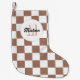 Chequered squares mocha brown white retro Monogram Christmas Stocking. Chequered squares geometric retro pattern Holiday gift. Cool retro chequered geometric square pattern. Personalise with your custom initial and name.
