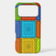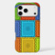 The central portion features a grid or chequerboard pattern composed of squares in red, golden yellow, green, and cyan.