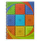 The central portion features a grid or chequerboard pattern composed of squares in red, golden yellow, green, and cyan.