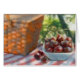 A bowl of red ripe cherries sits ready to eat next to a picnic basket under the dapple shade of a tree. The original is a miniature oil painting by Kathie Miller