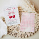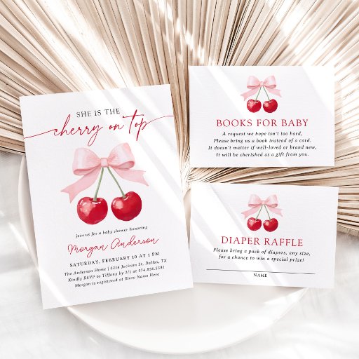 Celebrate the arrival of a little one with this elegant cherry themed baby shower invitation.