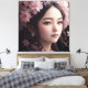 A girl adorned with a headdress made of pink cherry blossoms. The headdress includes a decorative element at the top center, which appears to be a golden ornament with a red gem or design in the middle. The girl is wearing traditional attire that complements the cherry blossom theme, with additional cherry blossom petals scattered around the hair and clothing. The overall esthetic is delicate and floral, evoking a sense of traditional beauty and nature.