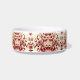 This is a heavy, durable bowl decorated with Tibbies of many colors, the perfect size for hungry/thirsty Tibs. The design is interesting and printing clear.