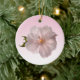 This holiday ornament features a single exquisite pale pink cherry blossom with droplets of water from a recent rain bathed in a rosy glowing light. It is set on a pink pastel gradient with a darker pink border.