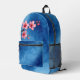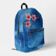 This floral feminine backpack features watercolor painted pink cherry blossoms an butterflies on a blue watercolor background. Customise it with your name at the side.