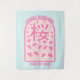 A Victor illustration of pink cherry blossom flowers falling to the ground. The text reads cherry blossoms as does the kanji Japanese text in the centre of the pink design..