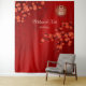 This Chinese wedding/ tea ceremony backdrop features red cherry blossoms and a gold double happiness symbol on a red background. Bride and groom names in a traditional elegant script. Matching wedding suit available.