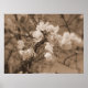 Sepia photo of a sprig of cherry blossoms aglow in the warm spring sunlight in front of a background of branches and sky.
