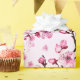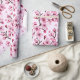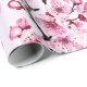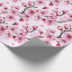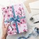 A beautifully detailed illustration of cherry blossoms in full bloom, featuring delicate pink petals with subtle gradients and intricate details. The flowers are accented by deep red buds and slender brown branches, creating a natural and harmonious contrast. The soft pink background enhances the gentle and romantic aesthetic