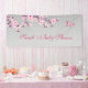 This baby shower banner features a pink cherry blossom branch on a grey background.