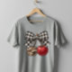 This unique design features a playful mix of patterns and textures. A pair of stylised cherries, one in a classic red and the other in a trendy camouflage, are tied together with a charming black and white plaid bow. The entire design is created with a realistic faux-embroidered effect, giving it a detailed, textured appearance without the actual stitching. It's a fun and eye-catching graphic that blends sweet, rustic, and edgy styles.