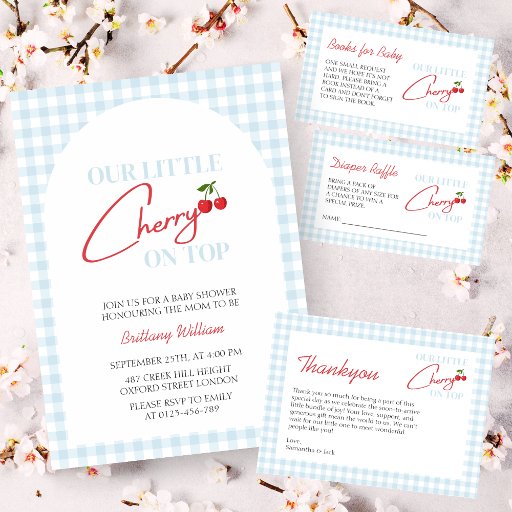 This design features a baby shower theme "Our Little Cherry On Top" with simple light pink chequered plaid pattern, arch frame and modern handwritten script with cute cherry illustration. This invitation can be easily personalised with your personal event details.