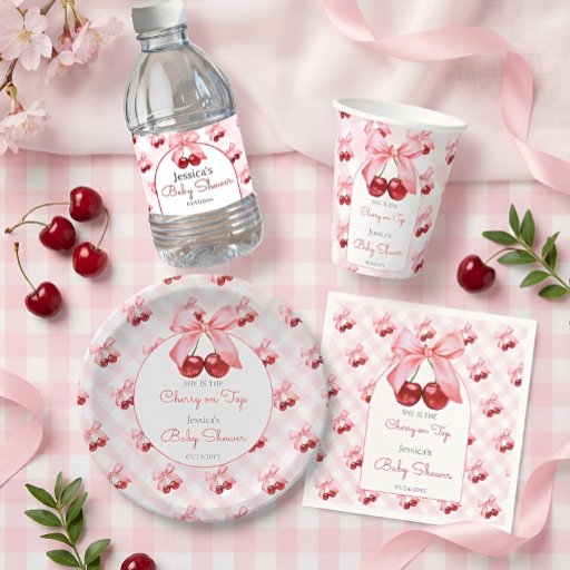 Add a sweet and stylish touch to your baby shower favors with this Cherry Baby Shower Paper Plates. Featuring a charming cherry and pink bow design with a gingham background, these Paper Plates is perfect for a coquette, berry, or baby girl shower theme.