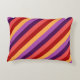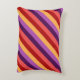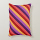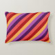 An accent pillow featuring a colourful pattern motif of diagonal stripes in cherry red, melon pink, violet, plum purple, and banana yellow.