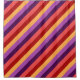 A shower curtain featuring a colourful pattern motif of diagonal stripes in cherry red, melon pink, violet, plum purple, and banana yellow.