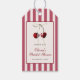 She's the cherry on top! Celebrate the upcoming nuptials of your favourite bride-to-be in style with our vintage inspired bridal shower gift tags! This design features beautiful watercolor cherries adorned with a white bow on a striped background.