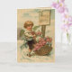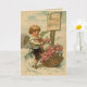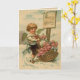 5” x 7” greeting card with a vintage image of an adorable blonde cherub carrying a birthday card in a pink envelope under his right arm and using both hands, a large basket of pink roses through the snow. There is a snow-capped sign that reads “Birthday Greeting” on a post beside him. The inside is cream and has a customisable sentiment that reads, “Thinking of you on your special day and sending loads of love your way.” See matching label and sticker. See the entire Birthday Greeting Card collection in the INVITES | Invitations & Cards section.