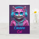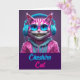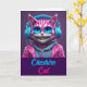 A pink Cheshire Cat is wearing turquoise glasses and headphones.