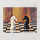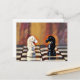 This chess postcard design features classic chess piece knights on a chess board with orange and yellow colourful accents.