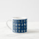 Expresso mug featuring chess design with dark and light chess pieces in rows on a blue background.